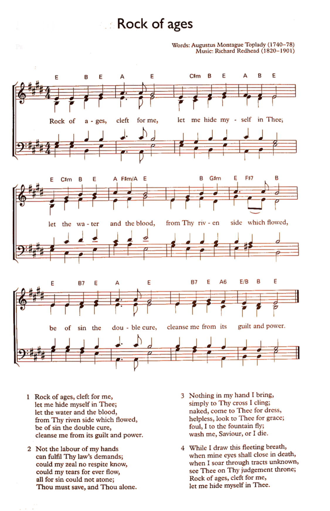 Rock of Ages is a popular Christian hymn written by the Reverend Augustus Toplady in 1763 and first published in The Gospel Magazine in 1775. Rock of Ages refers to Jesus. It is a play on words, making a connection between the smitten rock from Exodus ("You shall strike the rock, and water shall come out of it, and the people will drink." - Exodus 17:6) and the Crucifixion of Christ ("One of the soldiers pierced his side with a spear, and at once their came out blood and water." - John 19:34). As the prophet Isaiah wrote, "Trust in the Lord forever, for the Lord God is an everlasting rock" (Isaiah 26:4). See below, where you can hear Amy Grant and her husband, Vince Gill, perform this beautiful song.