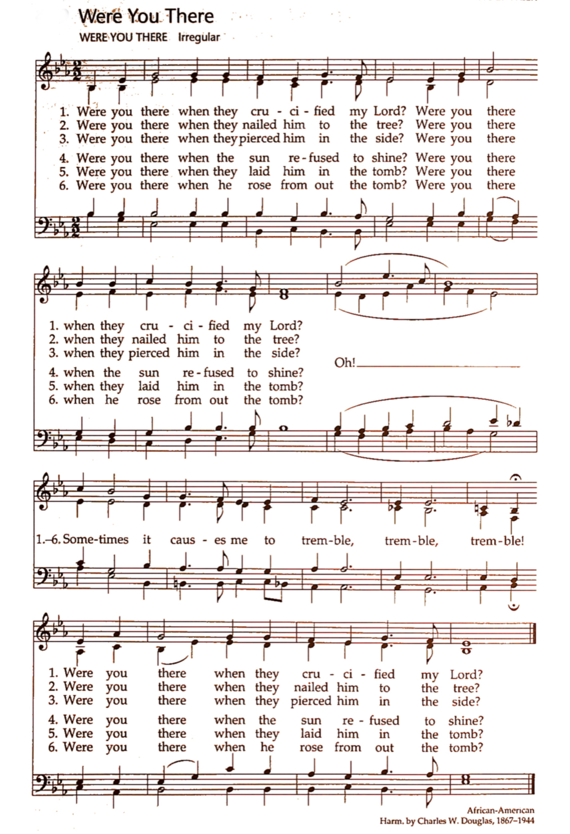 Where You There When They Crucified My Lord? Included in almost every major hymnal of the last thirty years, “Were You There” is one of the most prominent and popular of the African-American spirituals. Yet, like most spirituals, the origins of “Were You There” are impossible to trace, borne not from the pen of an individual but out of the communal slave experience. The series of questions that forms the basis of the song is obviously not meant to be taken literally; none of us were physically present at the passion of Christ. Rather, the questions call the community to bring the past to the present, to bring these historic events to bear on the now and make them part of our story today. Below you can hear the great Johnny Cash perform this song.
