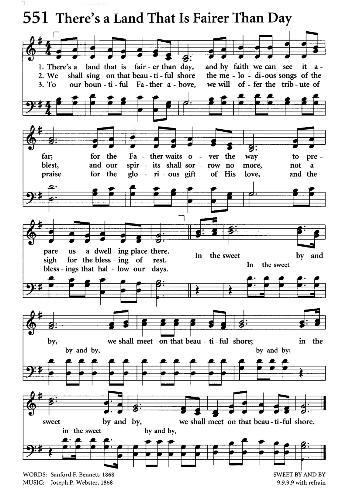 In the Sweet By and By (There's a Land That is Fairer Than Day), with lyrics by S. Fillmore Bennett and music by Joseph P. Webster, was immensely popular in the nineteenth century, became a Gospel standard and has appeared in hymnals ever since. The song continues to be regularly performed. Noteworthy recordings over the years have been made by Elvis Presley, Louis Armstrong, Johnny Cash, Glen Campbell, Dolly Parton, Willie Nelson, Loretta Lynn and the following, by the late Kenny Rogers.