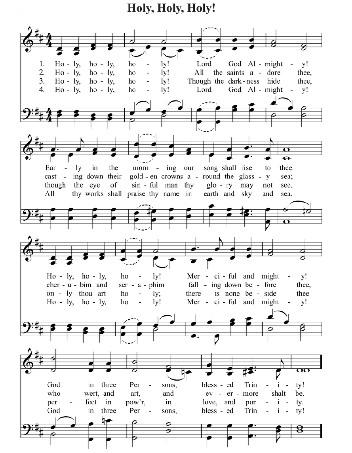 Holy, Holy, Holy written by the Anglican bishop Reginald Heber (1783–1826). Its lyrics speak specifically of the Holy Trinity, having been first written for use on Trinity Sunday. The opening line (Holy, Holy, Holy! Lord God Almighty!) references both Isaiah 6:3 and Revelation 4:8, and mirrors the opening line of the Sanctus hymn that has been part of Christian liturgies since the generation immediately following the Apostles. John Bacchus Dykes composed the tune Nicaea for this hymn in 1861, as a tribute to the First Council of Nicaea, which formalized the doctrine of the Trinity in AD 325. The great crooner Bing Crosby performs the tune below.